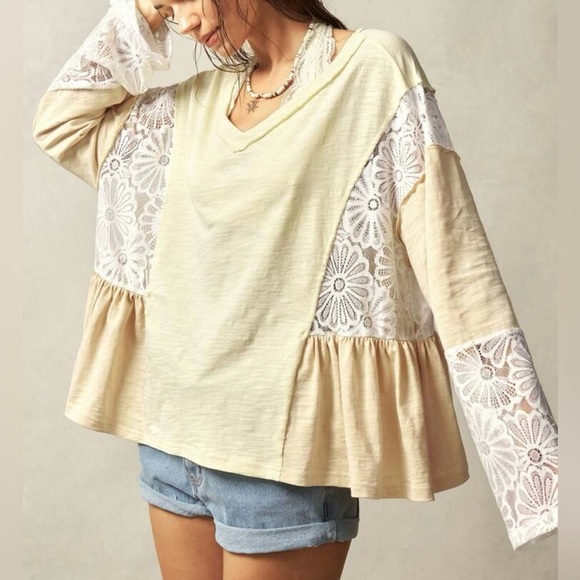 Elegant women's top featuring a blend of cream and tan with delicate lace accents. Perfect for a chic and stylish look.