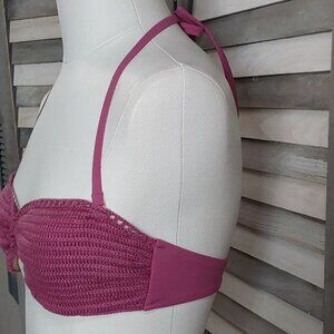 Add a dressy finish to your swim look with this Crochet Bandeau Bikini Top from Shade & Shore™. This pink bandeau bikini top features a supportive underwire design that's detailed with crochet texture for added flair. Made from soft, stretchy fabric, it offers flexible comfort whether you are swimming or lounging on the shore. The breezy open back comes with adjustable and removal tie straps and a hook closure to help you change the look in an instant. Plus, the removable padded cups offer customizable coverage.