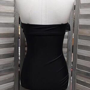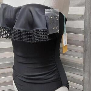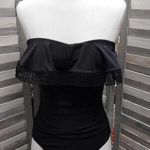 The Crochet Flounce High Coverage One-Piece Swimsuit from Kona Sol™ is a great pick to add some playfully chic style to your swim wardrobe. This one-piece swimsuit has a high coverage design that provides full torso and seat coverage, along with sewn-in cups for added bust coverage. A bandeau neckline puts a fun spin on a classic one-piece, and a ruffle along the neckline on both the front and back adds sweet detail. A solid black color gives the swimsuit a sophisticated look that's balanced out by crochet detailing along the ruffle for an added bit of texture.