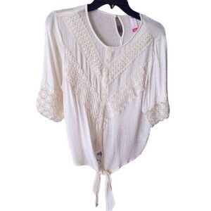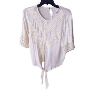 Women's Crop Top Boho Tie Front Crochet Lace Detail 3/4 Sleeve Shirt Sm