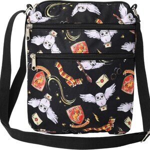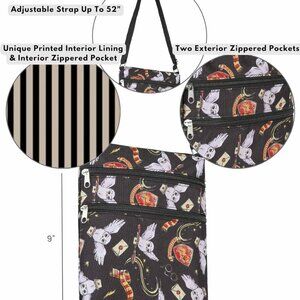 Features: Durable polyester canvas exterior with a fun Gryffindor all-over print. Spacious main compartment with zipper closure, plus two front zippered pockets for quick access to essentials like your wand or tickets. Adjustable shoulder strap for comfortable wear. Lining features a stylish black and grey stripe pattern. Compact size measures 9"x7"x1.5" — ideal for a smartphone, wallet, keys, and more.