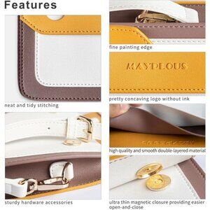 Shoulder bag is made with premium material: ① refined synthetic leather(PU) which is waterproof and durable; ② sturdy hardware in gold tone (the thickness of strap is appr. 0.2cm/0.08"; ③ closure type: ultra thin button with high megnetism, which is much easier to close; ④ embossing logo without paint which is more eco-friendly and never fade.