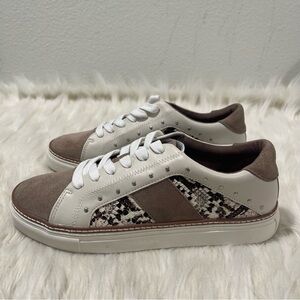 A patchwork of snake print and suede paneling brings boho vibes to the Kalinda low-tops from Crown Vintage. Silver studs outline the upper and contrast stitching details the sporty vulc sole.