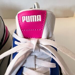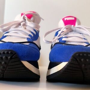 The Women's Cruise Puma Rider Lace Sports Shoes are a stylish pair of athletic sneakers from the popular brand PUMA. The shoes feature a synthetic upper material in a crisp white color with accents of bluemazing, making them a trendy and eye-catching option for women looking for sporty footwear. With a comfortable fit and a sleek design, these shoes are perfect for the beach, the gym, or just out for a casual walk.