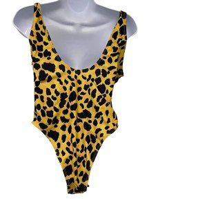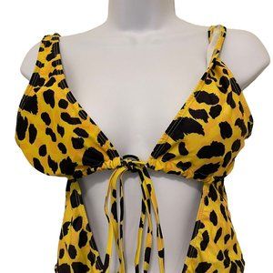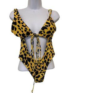 Stylish and daring swimwear choice. The vibrant yellow color combined with the black leopard print creates a bold and fashionable look. The swimsuit features a cut-out design and a wrap-around detail, adding a touch of uniqueness and sophistication. With its medium size, it offers a comfortable fit for a range of body types. Whether you're lounging by the pool or hitting the beach, this swimsuit is sure to turn heads.
