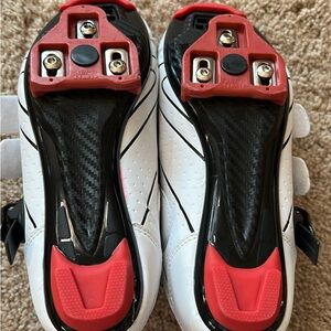 Durable and stylish cycling shoes in white and red. Perfect for cyclists seeking comfort and performance.