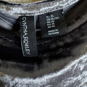 Beautiful Cynthia rally size extra large sleeveless crushed velvet tank in gray/silver. This material catches the light and shimmers. It has a high low effect being lower in the back. I see no flaws. Please see photos for details. The pit to pit measurement is about 22 inches laid flat.