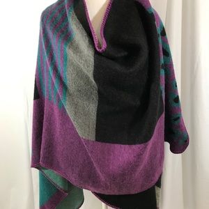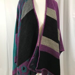 This item for your consideration is a beautiful shawl/wrap; it has very vibrant colors and abstract designs; it is very soft to touch; there is no tag stating just what it is made of, but I am quite certain that it is some sort of polyester/cotton; none-smoking but pet friendly home