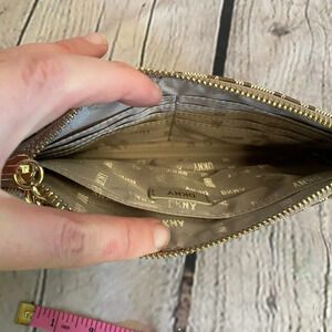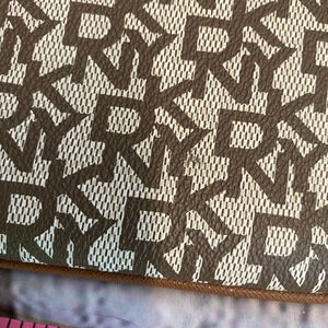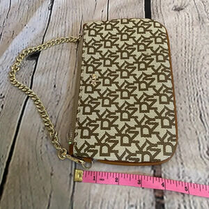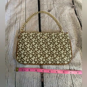Women’s DKNY Logo Mini Slim Chain Handle Clutch Bag Purse Tan Beige Brown