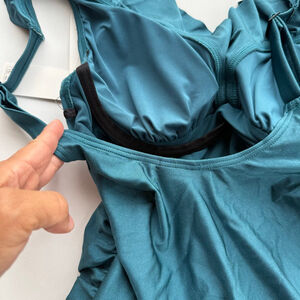 This is a new with tags DKNY women's one-piece swimsuit in a teal color, size S. The swimsuit features ruffled straps and a ruched design on the torso for a flattering fit. It includes removable cups and underwire support, as indicated by the tag. The material composition is 83% nylon and 17% spandex for the shell, with a lining of 85% nylon and 15% elastane. The swimsuit also offers UPF 40+ protection, stretch, and tummy compression.