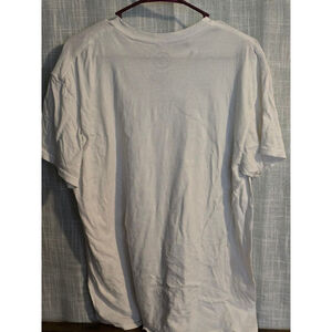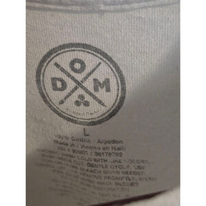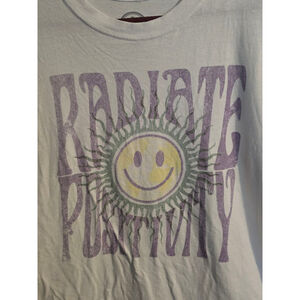 This is a pre-owned white t-shirt, size large, from the brand DMO. It features a graphic print on the front with a smiley face and the words "Radiate Positivity". The shirt is made of 100% cotton. There are visible wrinkles throughout the fabric, indicating previous wear and washing. No stains or tears are apparent upon initial inspection.