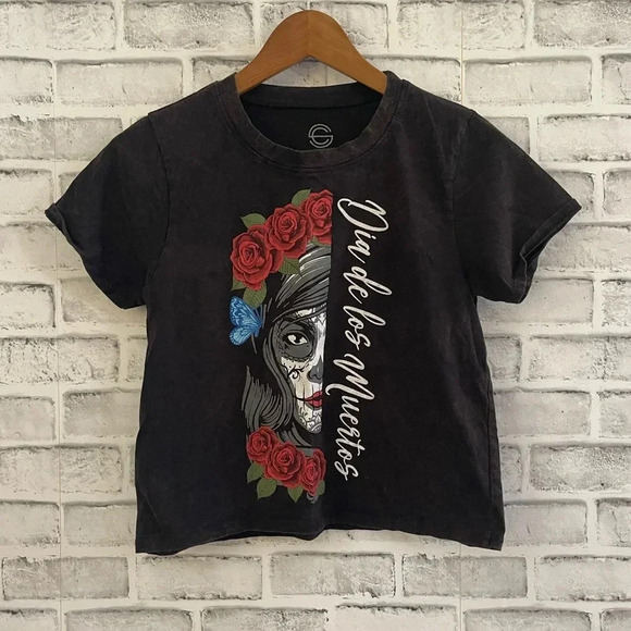 Women’s. Día de los Muertos. Day of the Dead. Black short sleeve crop top. Has a heathered brown pattern. Excellent preowned condition. Size Medium.