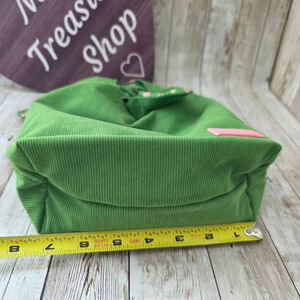 This is a Daisy Wild Marc Jacobs pouch. The exterior is made of green corduroy, while the interior features a green floral pattern. The pouch has bunny ear-shaped handles. The item is new without tags or box. The pouch is made of 100% recycled post-consumer polyester.