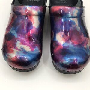 A pair of iridescent, abstract rainbow // tie dye pattern slip-on clogs by Dansko in women's EU size 40, which is approximately US women's size 9. Gorgeous coloring.