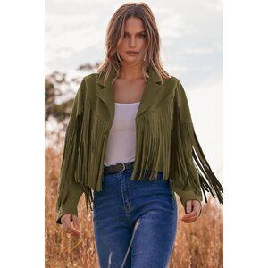 Women's : Dark Army Green Faux Suede Leather Tassel Motorcycle Cropped Jackets
