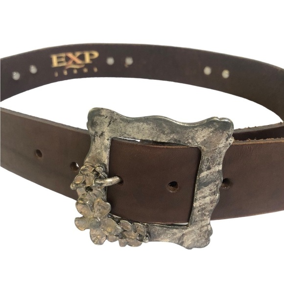 Beautiful Pewter color Flower Buckle and Accent Charms on this dark brown genuine leather belt. By EXP Jeans, made in Italy.