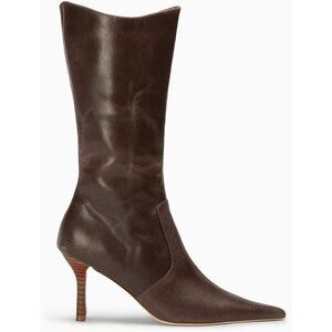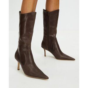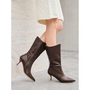 ⚡Women's Dark Brown Mid Calf Boots Pointed Toe High Heel Long Boots Side Zipper