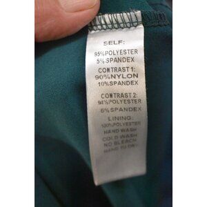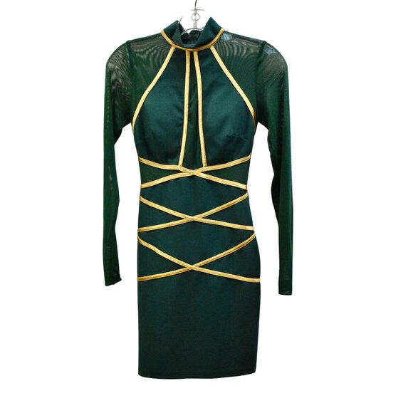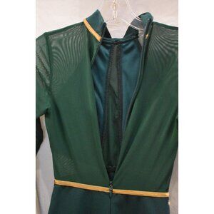 Women's Dark Green Bodycon Dress High Neck Gladiator Gold Trim Sheer Sleeve Sz X