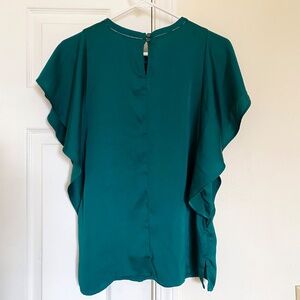 Women's sleeveless blouse with ruffle trim and side slits at waist.