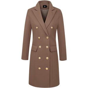 Features: Long sleeve, classic notch lapel collar, double breasted front, side flap pockets, knee length