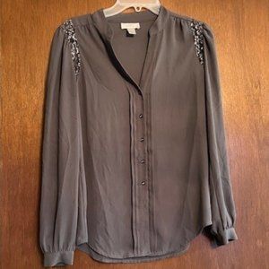 Women's Dark grey Loft blouse size xs. Made in India. 100% polyester. Machine wash cold. Lace insets at the shoulder.