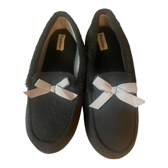 Women’s Dearfoams Slippers. Size 9/10. These slippers are in excellent preowned condition with minimal wear.