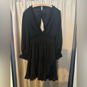 Summer Cute Dress: deep v-neck, long flared sleeve, ruffle detail, empire waist, backless design and flowy A-line hem. Elegant and flattering look. A must-have for 2024 summer fashion.