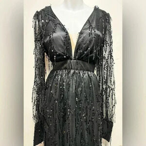 Women's Deep V-Neck Sequin Long Sleeved Dress with Slit Extra Long