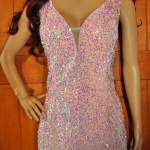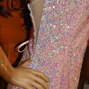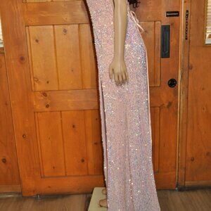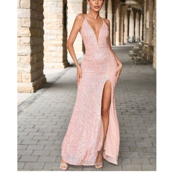 Women's Deep V-neck Sequin Embellished Slit Spaghetti Strap Dress sequin covered with sequins throughout; giving you an hourglass bodycon fit. This Sparkly Gown is perfect for your next event ; perfect for a Prom dress, bridesmaids dress, Gala or red carpet dress or even a military ball! Shine bright in this beautiful floor length gown and have all eyes on you for your next special occasion. size Large waist 32/34 in. bust32/36 in. length 60 in. amazon $100.00 Pink color