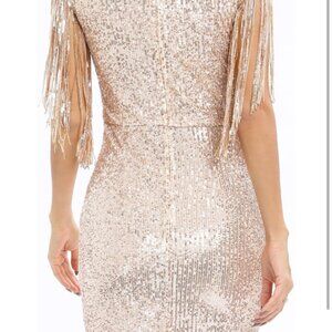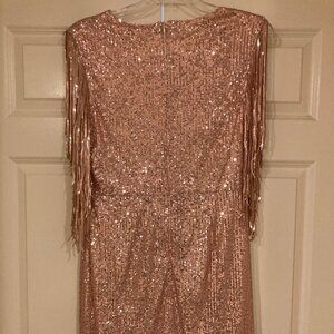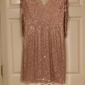 Rose gold v-neck sequin party dress. Never been worn before, stretchy material. Fringe sleeves, zipper in back.