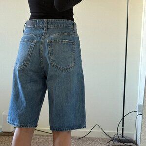 Comfy high-waisted denim shorts with a loose, knee-length fit. Easy to style with a tee or tank, perfect for everyday wear. Good condition, no stains or damage.