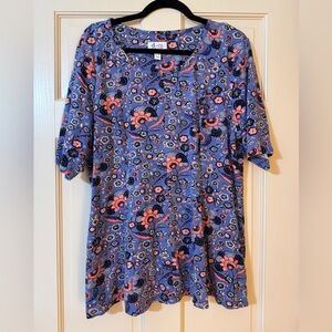 Women’s Denim & Co Floral Top L. Stylish short sleeve top with abstract floral print. Features scattered blooms in pink tones against a blue background. Artistic pattern creates visual interest. Relaxed silhouette with classic crew neckline. Excellent condition.