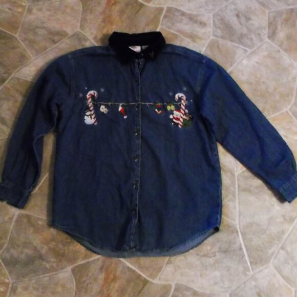 Womens Denim Embroidered, Button Up Christmas Shirt- Candy Canes, Snowman- Sz S