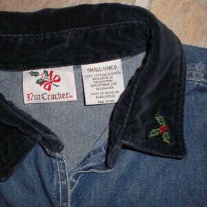 Nutcracker Womens Long Sleeved, Button Front, Denim Christmas Shirt embroidered with Candy Canes, Snowman, Santa, Stockings, Gloves, Holly and Snowflakes. Black collar has a sprig of holl also.