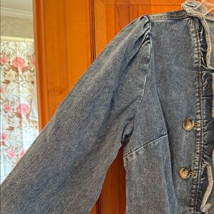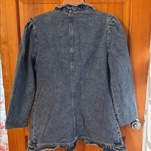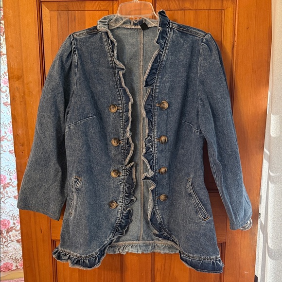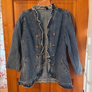 Stylish denim jacket with ruffle detailing. Perfect for casual outings. Features a classic blue color. Open front. Has pockets. Size large. Gives very much magnolia pearl boho vibes.