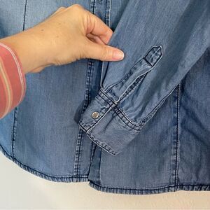Denim Shirt with Rhinestones on shoulders and pearl snaps.