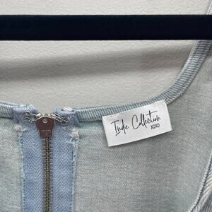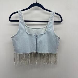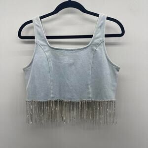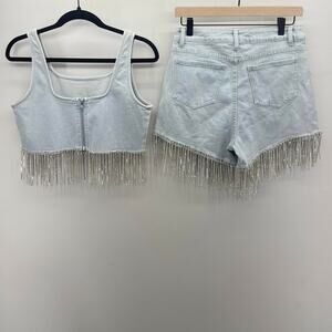 Stylish denim skirt set featuring a chic fringe detail. Perfect for casual outings or a night out. Available in a classic light blue color.