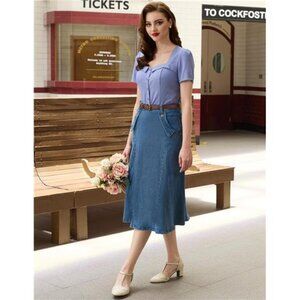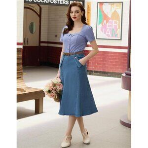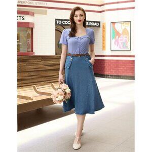 Lightweight Denim Skirt: The Denim Jean skirts feature with high waist design, elastic back waistline, fit and flare aline skirt, knee length midi skirt, pull on, two side versatile pockets for keys, cards, phone.