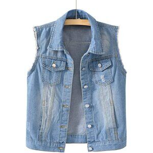Features: Classic sleeveless denim vest with a lapel collar and single-breasted front. It has a great fit with subtle pleats at the armholes, plus plenty of pockets—two buttoned flap chest pockets, two side pockets, and inner pockets for all your essentials. Perfect to layer over tees or dresses, making it a go-to for casual outings or travel.