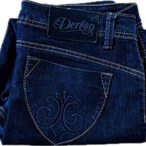 These Dereon Straight Jeans are in good condition. The jeans include several pins on pockets and embossed designs on back pockets. The jeans come in a dark wash with a brown stitch. The leather Dereon tag on back has a little bit of wear to it. Otherwise, these jeans are in very good condition.