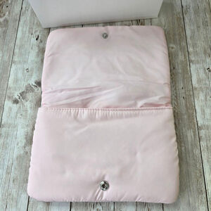 This is a new Dior pouch, complete with its original box. The exterior is a light pink, quilted nylon material, adorned with a silver-tone 'CD' logo. The interior is lined with matching pink nylon and features a snap closure. The item is in pristine condition, showing no signs of wear or imperfections.