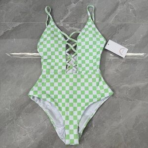Brand new with tags - Women’s Dippin’ Daisy’s Bliss One Piece Swimsuit Checked Out. Has adjustable straps and removable pads. Colors: green and white. Size: XS.