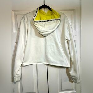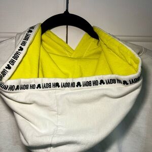 Only worn 1-2 times, did not love the fit on myself. Hood strings say icon, and trim of hood states Oh Boy! Size XL