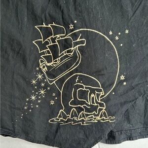 If you don't want to grow up, you can live out your child-like dreams while you're wearing this dress from Disney's Peter Pan. The black A-line dress has hints of pirate inspiration, from the slightly asymmetrical layered hem to the ribbon waist corset details on either side of the dress. A gold foil print of Skull Rock and the Jolly Roger flying over the moon is featured on the bottom right of the skirt. Back zipper closure.