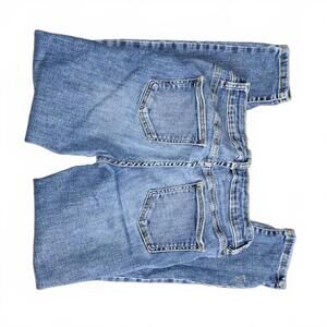 Womens distressed blue denim jeans featuring a classic five-pocket design.
