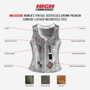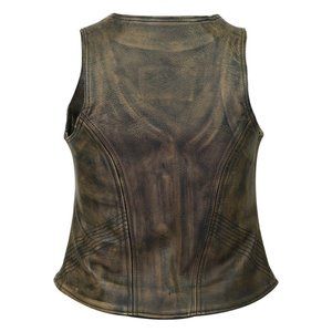 If you want a truly feminine look then try on the Women's Distressed Brown Leather Vest with plain sides. The vest is accented with black stitching which offsets the distressed brown leather beautifully. There's plenty of room for those little knick-knacks that the ladies love to carry. Also, this vest comes equipped with gun pockets on both sides so she can step out well-protected and no one will be the wiser.
