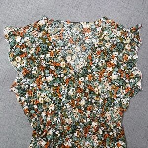 Women’s Ditsy Floral Print Ruffle Trim V Neck Smocked Waist Short Sleeve Boho Maxi Dress. Beautiful green & orange fall floral bohemian print. Ruffled trim at arms and hem. Smocked elastic waist for a forgiving easy and fun style for any event! Perfect with boots or heels. Ideal for casual parties, a dinner date, outdoor events or just a day out. Size medium, large or XL. True to size, has a slight stretch. 95% Polyester 5% Spandex. New.