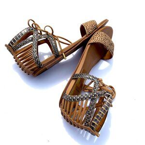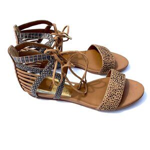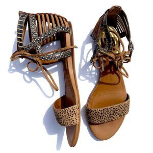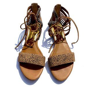 Give your feet some exotic flair with these Dolce Vita Ashtyn Flat Boho Lace Up Sandals, in Sand Spotted Snake Leather. Pre-loved, sleek strappy with suede laces at a sweet price.