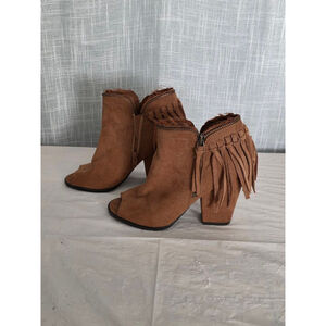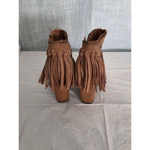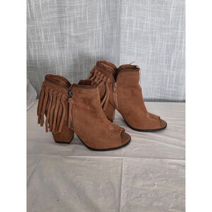 These pre-owned Dolce Vita ankle boots, size 6.5, feature a brown faux suede exterior with an open-toe design. The boots have a block heel and a decorative fringe detail around the ankle, secured by a functional zipper. The soles show signs of wear, and the interior lining has some discoloration. The faux suede material appears slightly worn in certain areas.