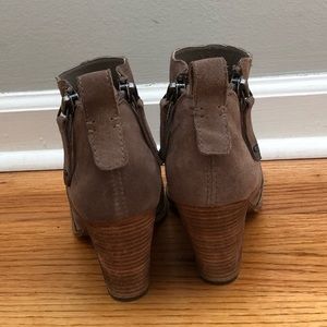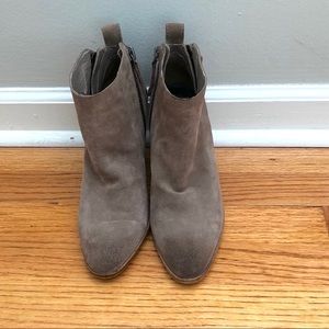 Women’s Dolce Vita Booties - Soft Suede - Taupe - Size 9 1/2 - dual side zippers (both sides of the bootie) - 3 1/2 stacked block heel - burnished round toe - only worn one season. Good condition. Color may vary slightly from photo.